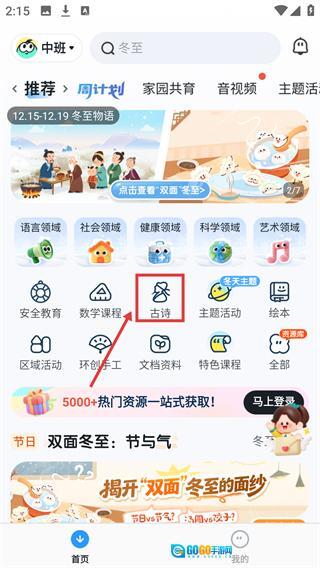 1、进入【中班】页面后,找到并点击【古诗】选项,即可进入对应的板块。