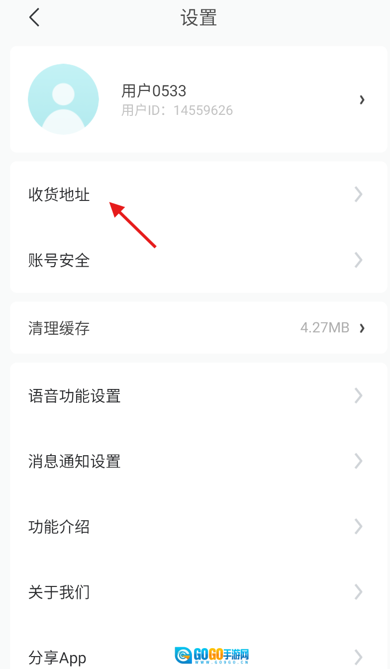 3、在设置界面里,找到并点击第一个选项“收货地址”,进入收货地址管理页面。
