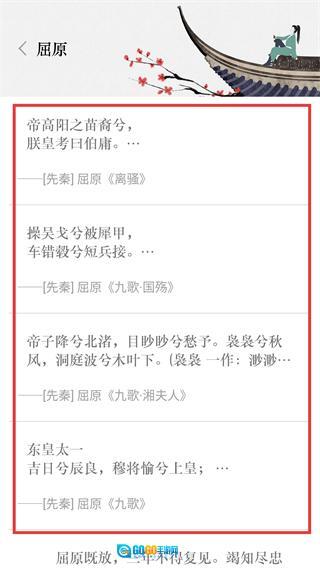 4、点击【屈原】后,页面会呈现他的作品列表,里面有《离骚》《九歌·国殇》等多部经典作品,能够查看详细内容。
