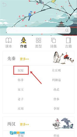 3、进入【作者】标签页后,在【先秦】分类区域找到【屈原】选项并点击,就能进入该作者的相关内容页面。