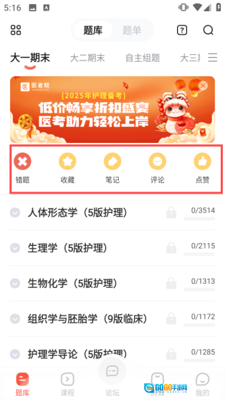 在题库界面里,能借助【错题】【收藏】【笔记】【评论】【点赞】这些功能来管理学习内容。