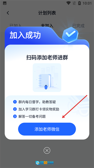 4、成功加入计划后,会弹出提示【扫码添加老师进群】,点击【添加老师微信】即可获取督学及其他备考服务。