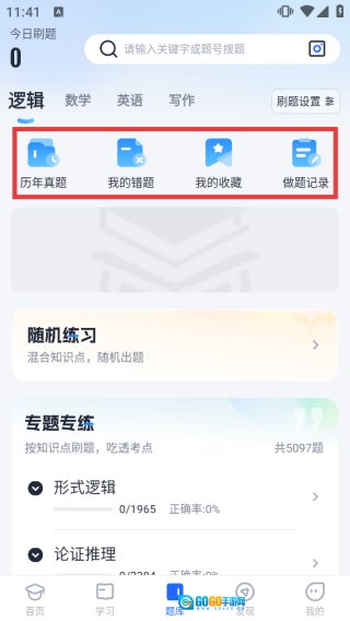 2、点击底部的【题库】选项,进入题库页面后,能借助【历年真题】【我的错题】【我的收藏】【做题记录】这些功能,开展真题练习、整理错题、收藏题目以及查看做题历史。