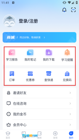 3、点击底部的【我的】选项,进入个人中心页面后,可查看【学习报告】【我的笔记】【我的】等与个人学习相关的信息,同时还能进行订单查询、使用优惠券、查询快递、兑换码等操作。
