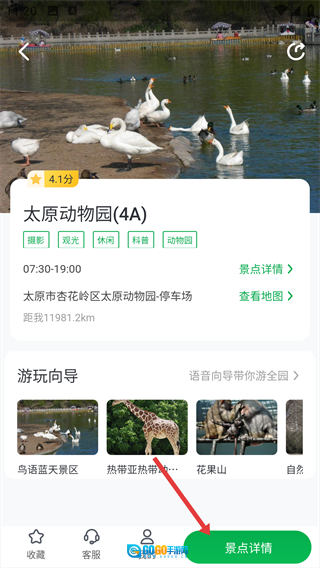 4、进入景点详情页面后,点击页面底部的【景点详情】按钮,就能查看该景点的开放时间、地址等相关信息。
