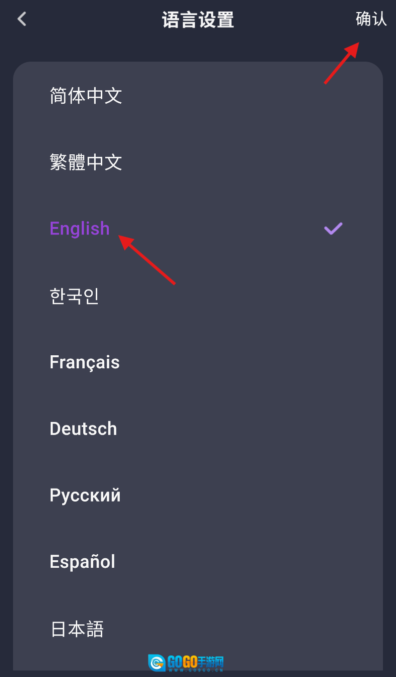 4、在语言列表里选中“English”,认真核对确认无误后,点击确认按钮即可完成语言切换。
