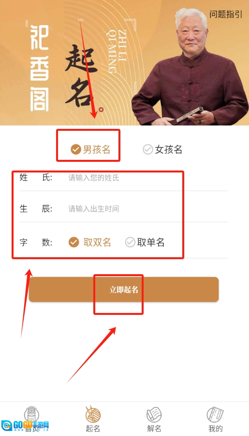 2、若要给男生取名,可点击“男生”选项,输入姓氏、出生时间以及期望的字数,随后点击“立即起名”。