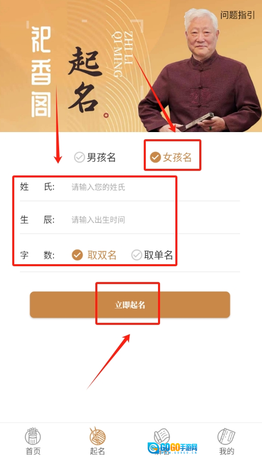 2、依据需求挑选“新生儿起名”“公司取名”等模块,录入姓氏、性别等相关信息。