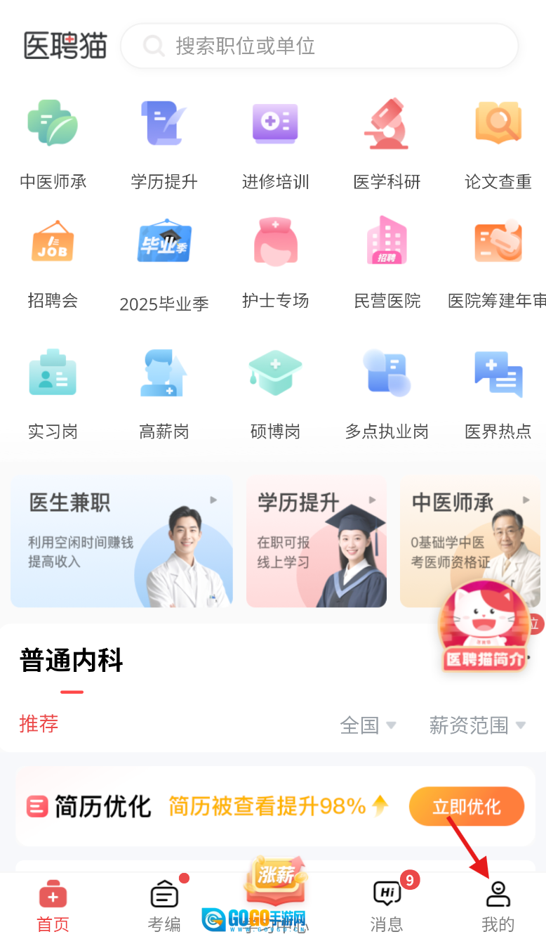 1、启动医聘猫医疗招聘求职人才网软件,在主界面找到并点击“我的”选项。