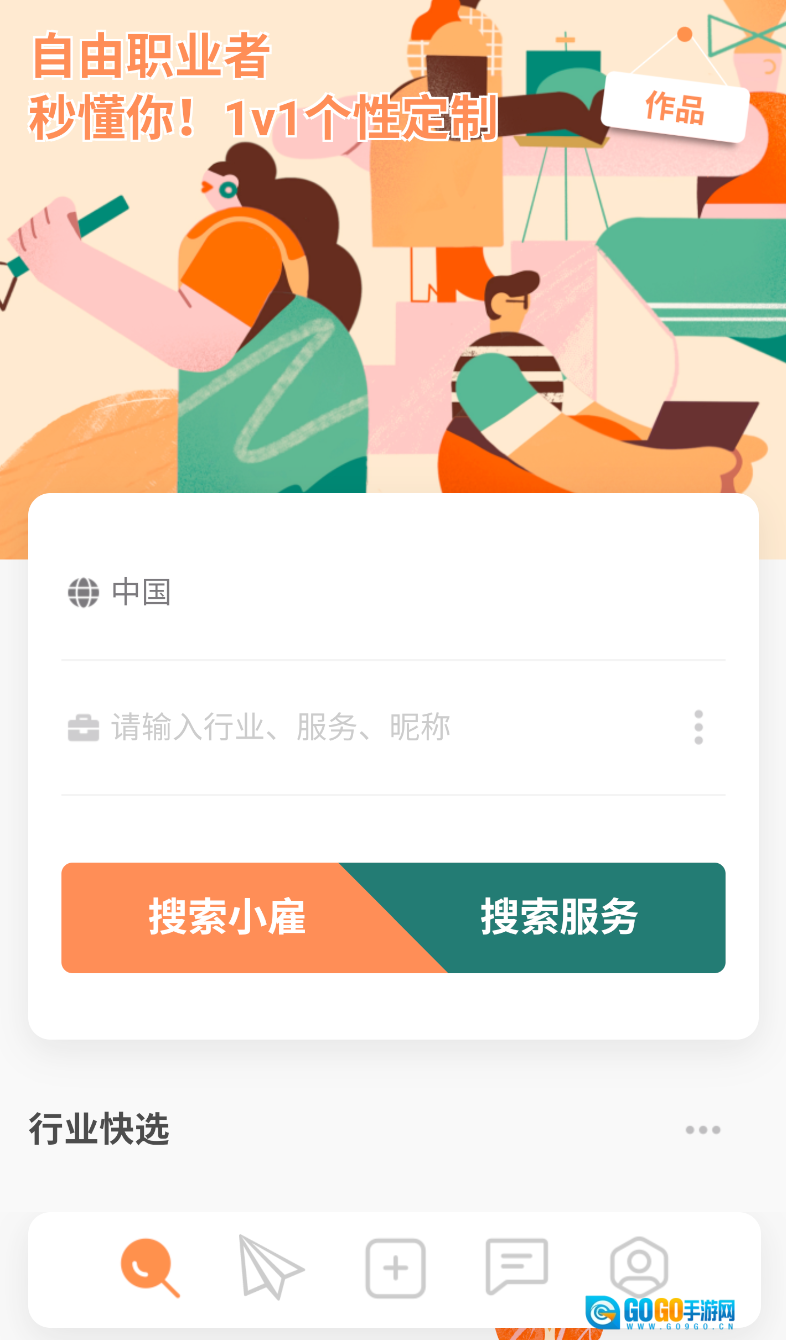3、功能使用:自由职业者点击 “创建工作” 发布服务信息,雇主通过搜索栏筛选服务者。