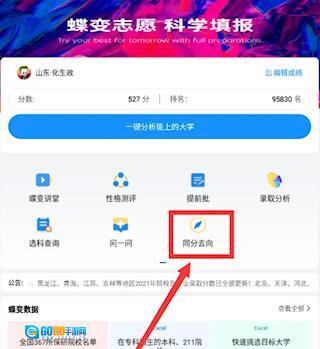 1、打开蝶变志愿应用,在首页顶部的功能栏里找到“同分去向”功能入口。