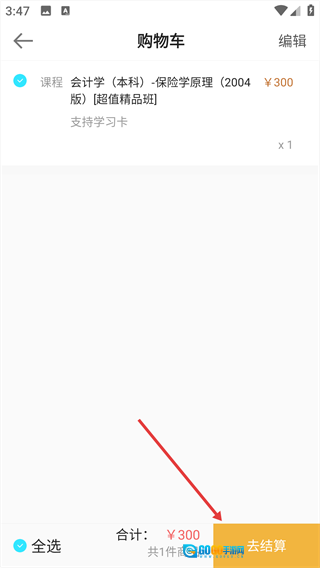 4、进入购物车页面后,点击页面底部的【去结算】按钮,即可完成报名流程。