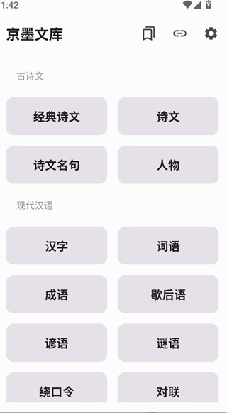 1、打开京墨文库后,在首页挑选诗文、成语、对联或者谜语模块,即可开启学习之旅。