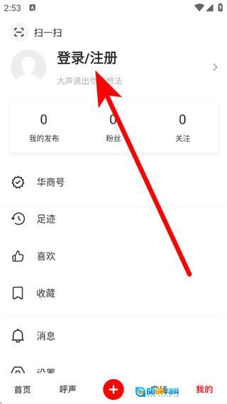 2、在我的页面,点击登录注册区域,进入登录界面。