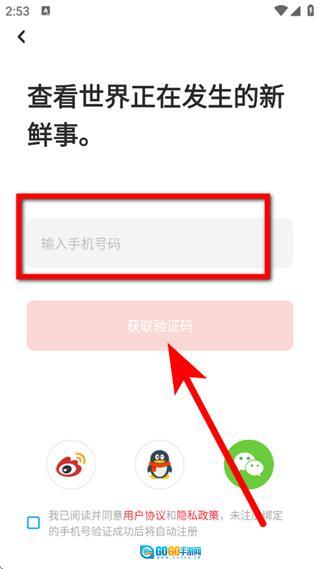 3、在登录界面,输入手机号码,点击获取验证码。