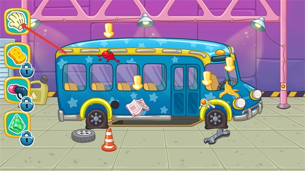 2、点击左侧的【手套】工具,对准巴士上的污渍区域,着手清理杂物,以推进清洁流程。