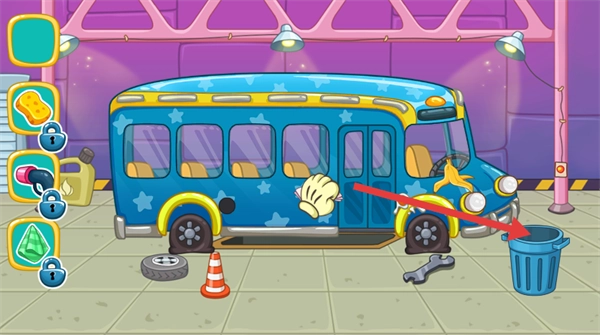 3、使用【手套】工具把巴士上的垃圾拖到【垃圾桶】里,完成杂物清理这一步骤,为接下来的清洁工作做好准备。