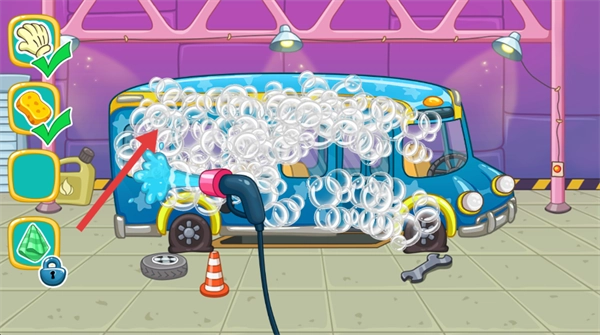 4、借助界面里的【清洗工具】向巴士喷射泡沫,完成车身的清洁操作,以进一步推动巴士的清洁流程。