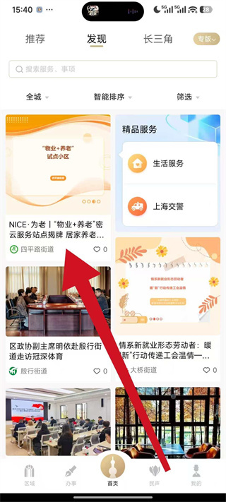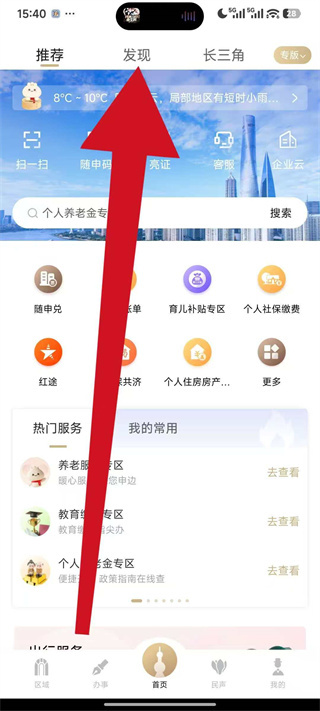 1、打开上海人社应用,点击顶部导航栏中的“发现”标签,即可进入发现页面。