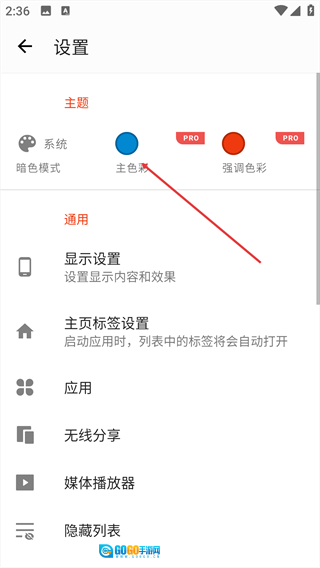 3、找到【主题】分类下的【主色彩】选项,点击进入主题色彩的选择界面。