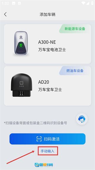 2、在添加车辆页面,选择对应设备类型后,点击【手动输入】选项,可进入手动填写设备信息的界面。