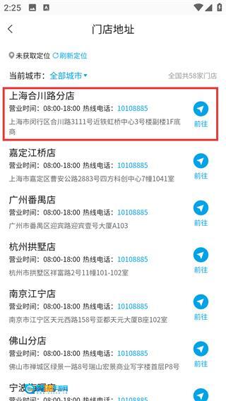 3、进入【门店地址】页,查看如【上海合川路分店】的营业时间、地址,点击【前往】可获取到店指引。