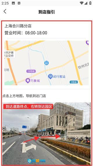 4、在【到店指引】页,能看到【上海合川路分店】的地图及路线提示,点击地图可导航,还能查看实地指引图。