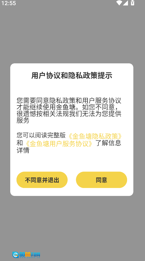 1、打开已成功的金鱼塘App,首次使用会弹出权限与协议提示,点击“同意”以进入主界面。
