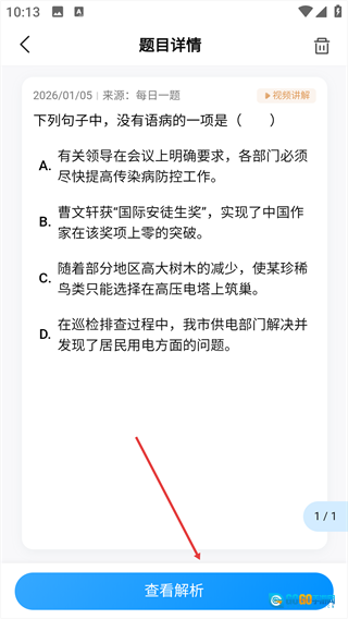 4、进入题目详情页面后,点击页面底部的【查看解析】按钮,就能看到这道题的解题分析内容了。