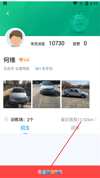3、进入教练详情页面后,点击页面底部的“直接咨询教练”按钮。
