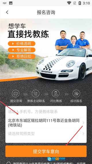 4、把手机号、地址、驾照类型等信息补充完整后,点击“提交学车意向”按钮,就能完成学车咨询的提交操作。