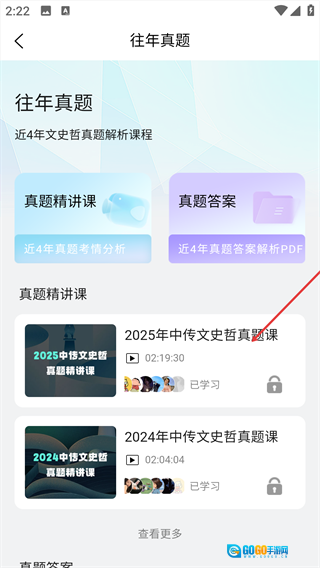 2、进入【中传文史哲】页面后,找到“真题精讲课”板块,点击其右侧的【更多】按钮。