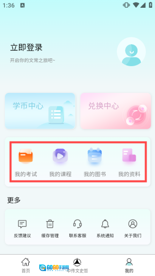 在【我的】页面中,用户能够查看并管理【我的考试】【我的课程】【我的图书】【我的资料】等各类个人学习相关资源。