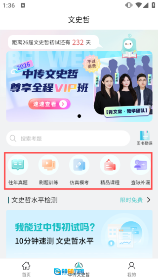 2、切换到【中传文史哲】页面后,就能利用【往年真题】【刷题训练】【仿真模考】【精品课程】这些功能,开展有针对性的备考复习。