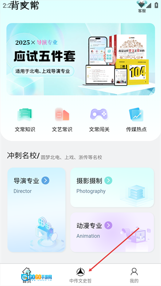 1、打开背文常应用,进入首页后,可点击【文常知识】【文艺常识】【文常闯关】【传媒热点】等功能模块,进而学习与之相关的知识内容。