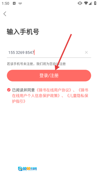 1、输入手机号码,勾选同意相关协议后,点击【登录/注册】按钮。