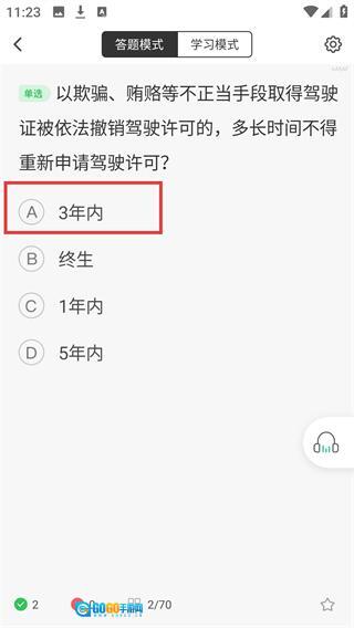 4、继续回答【时间类题目】,当前题目为“通过不正当手段获取驾驶证被撤销后,多长时间内不得重新申请”,选择【3年之内】来完成该题,以此积累答题进度。