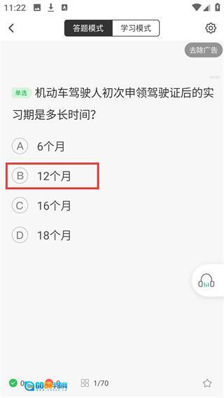 3、进入【时间题】答题页面,当前处于【答题模式】,需回答“初次申领驾驶证实习期时长”这一单选题,选择【12个月】即可完成该题作答。