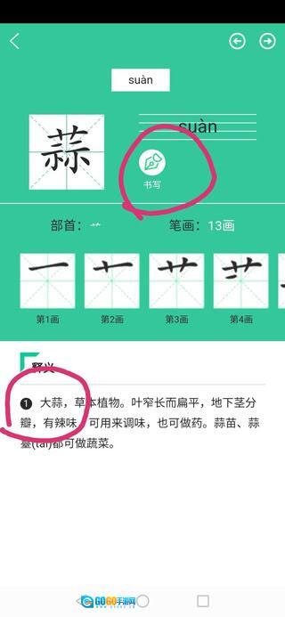 9、点击每个生字,接着点击书写按钮,即可查看该生字的书写笔顺以及相关组词。