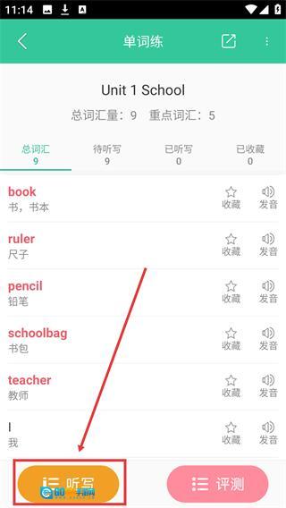 4、进入【Unit-1-School】词汇页面后,点击底部的【听写】按钮,就能启动该单元词汇的听写练习,从而巩固单词记忆。