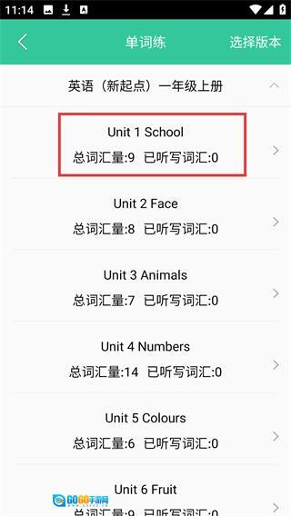 3、在教材词汇列表页面里,找到【Unit-1-School】这个单元,点击它就能进入该单元的词汇详情页面。