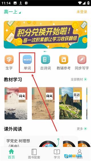 1、在首页找到【单词】功能入口,点击该入口即可进入单词学习相关页面,开启英语词汇练习。