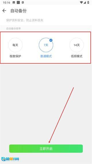 4、进入自动备份页面后,选择合适的同步频率,随后点击页面底部的“立即开启”按钮,即可启用该功能。