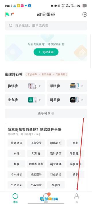 1、打开知识星球,进入星球页面后,点击底部的“我的”选项,即可进入个人页面。