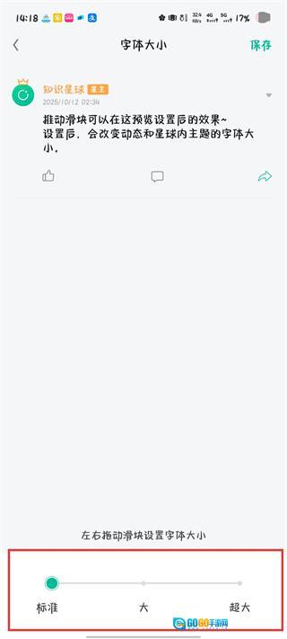 4、进入字体大小设置页面后,通过拖动滑块来选择标准大或超大的字体尺寸,选定合适的选项后,点击保存按钮即可完成设置。
