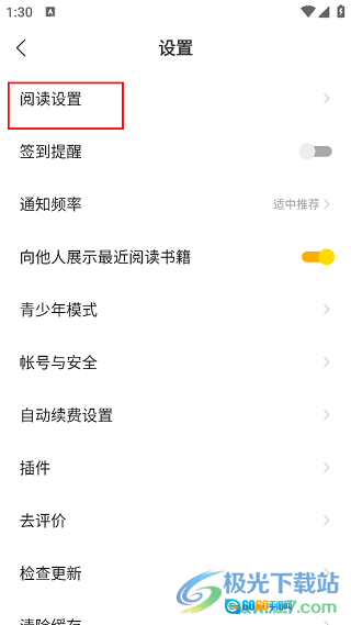3、点击后会进入“设置”界面,在此需点击列表中的“阅读设置”选项。