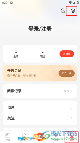 2、切换至右下角的“我的”板块,随后点击个人中心页面右上角的齿轮图标。