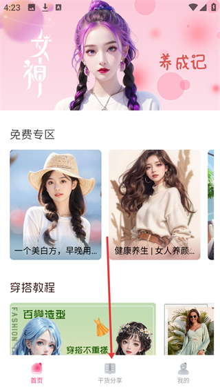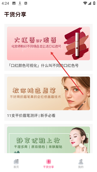 在“女神养成记”首页,点击底部的【干货分享】选项,就能进入美妆护肤类内容的展示页面。