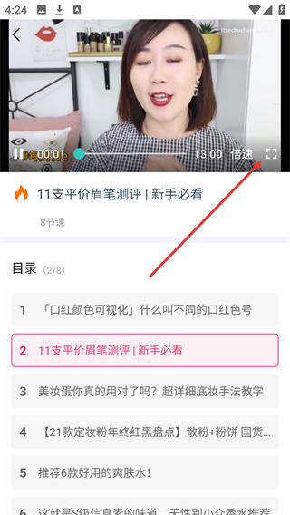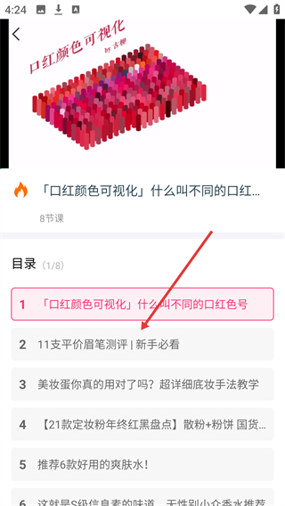 在干货分享页面,点击目标内容卡片(例如口红相关教程),即可进入该内容对应的课程目录界面。
