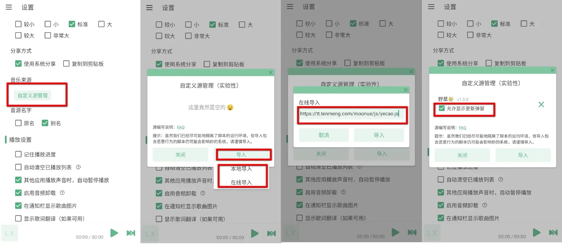 【设置】→【导入】→【在线导入】或【本地导入】→填写音乐地址→全选导入的音源